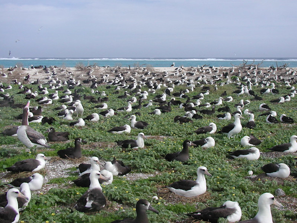 | Laysan and black-footed albatrosses nesting in Midway Atoll National Wildlife Refuge. Roughly one-third of nesting Laysan albatross pairs are female-female. Photo: U.S. Fish and Wildlife Service-Pacific Region/David Patte via Flickr Creative Commons (CC BY-NC 2.0). |