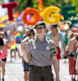 | Employees and volunteers from national parks in the Pacific Northwest walk in the Seattle Pride Parade in June 2022. Photo: Mount Rainier National Park/Kevin Bacher via Flickr Creative Commons (CC BY 2.0). |