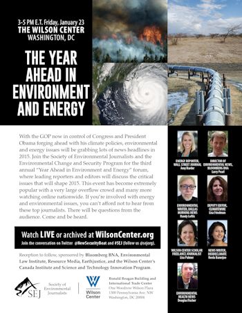 With the GOP now in control of Congress, and President Obama forging ahead with his climate policies, environmental and energy issues will be grabbing lots of news headlines in 2015. Join the Society of Environmental Journalists and the Environmental Change and Security Program for the third annual “Year Ahead on Environment and Energy” event, where leading reporters and editors will discuss the critical issues that will shape 2015.