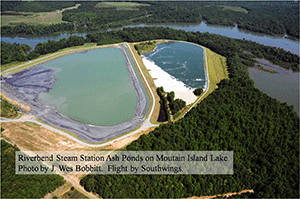 Coal-burning power plants produce vast volumes of waste material. Some of this is "fly ash," the particulates that would otherwise go up the smokestack but are caught by pollution-control equipment. There are lesser volumes of bottom ash, boiler slag, and flue gas desulfurization gypsum. Taken together, they constitute one of the largest waste streams in the U.S., roughly 135 million tons per year. One problem with these wastes is that they contain significant amounts of toxic heavy metals. The ultimate disposal of these materials is a huge, controversial issue that is beyond the scope of this discussion. But before they are disposed of, they are often mixed with water and held in slurry ponds ("coal-ash impoundments"), which at least keep them from blowing all over the place. Because of the difficulties of disposing of coal ash, it is often held in such ponds for long, indefinite periods of time.