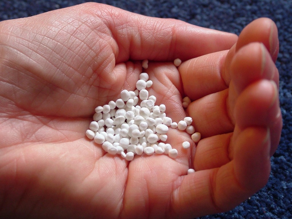In manufacturing, polystyrene usually starts as small beads. These dense, hard beads are softened by heat and expanded using things like steam and blowing agents, becoming much larger and less dense beads.