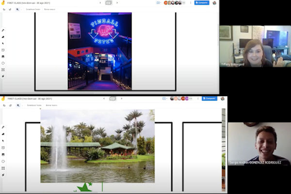 | University of Michigan student Tiffany Borregard (top right) and UNIMINUTO student Sergio Andrés González Rodríguez (bottom right) introduce themselves to classmates by talking about favorite places in their hometowns of Ann Arbor, Mich., and Bogotá, Colombia. Image: Courtesy Emilia Askari. |