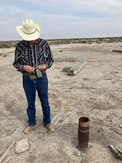 | Rancher Schuyler Wight stands next to an orphan well on his property near the Pecos River in the Texas Permian Basin. Photo: Martha Pskowski. |