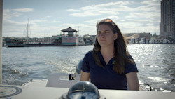 | Bluewater Baltimore scientist Alice Volpitta in her monitoring boat. Photo: Duy Linh Tu and Sebastian Tuinder. |