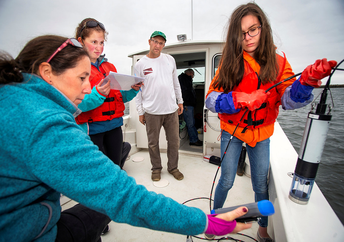 | Students from the local aquaculture high school collecting water samples with teacher Holly Turner (foreground) and salvage diver Kevin Blagys (at rear), who volunteered many hours gathering water and seaweed samples. Photo: Melanie Stengel, Connecticut Health Investigative Team. Click to enlarge. |