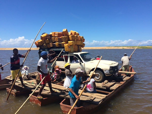 | For two young journalists tracking the path of illegal rosewood trade, travel in northeastern Madagascar required crossing rivers in rafts like this one. Photo: Edward Carver. Click to enlarge. |