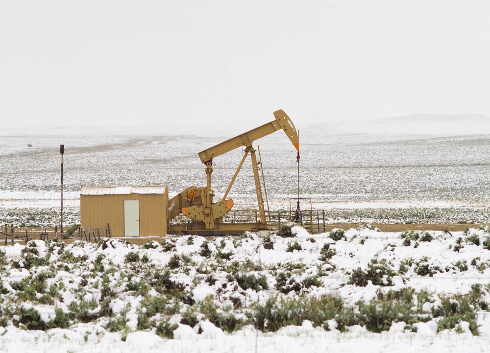 | A pump jack in the Moneta Divide oil and gas field east of Shoshoni, Wyo., where a local reporter learned a proposed surface water discharge permit would result in massive discharges of pollutants into creeks and a state park reservoir, as well as a town drinking water supply. Photo: Angus M. Thuermer Jr./WyoFile. Click to enlarge. |