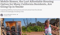For more, visit “Mobile Homes, the Last Affordable Housing Option for Many California Residents, Are Going Up in Smoke” by Anne Marshall-Chalmers for Inside Climate News (Outstanding Feature Story, Small: SEJ 22nd Annual Awards for Reporting on the Environment).
