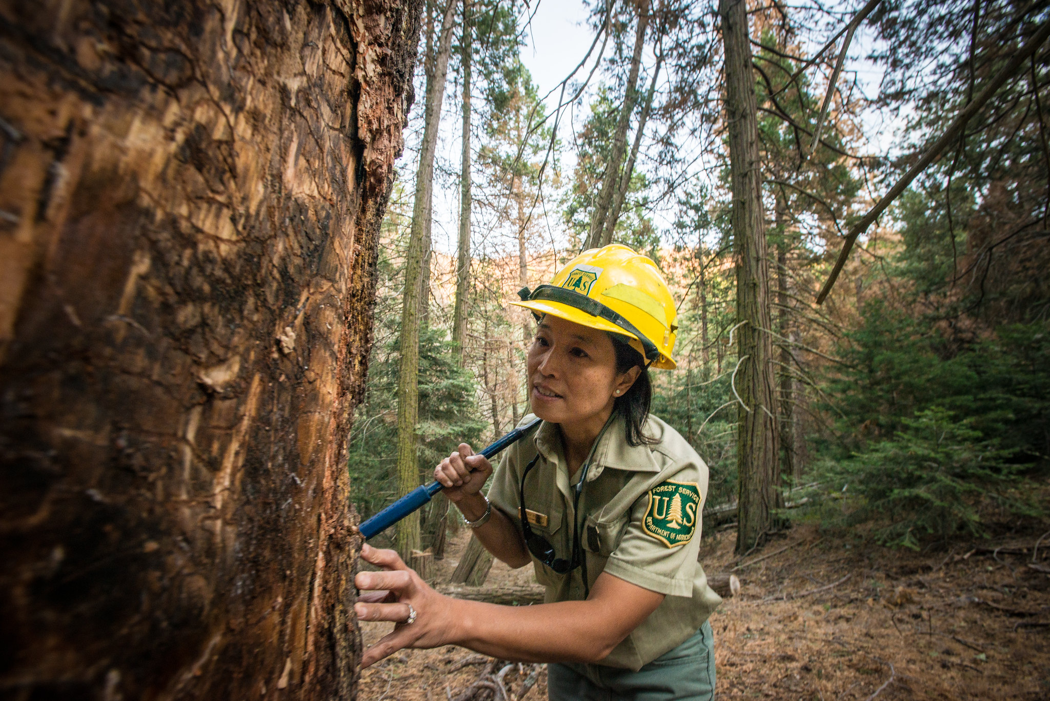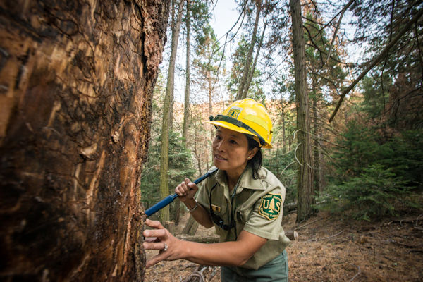 | Forest Service databases allow journalists to track the health of U.S. forests. Above, Forest Service entomologist Beverly Bulaon searches for pine bark beetles in dead Ponderosa pine trees in the Sequoia National Forest, near Posey, Calif. Photo: USDA Forest Service/Lance Cheung. Click to enlarge. |