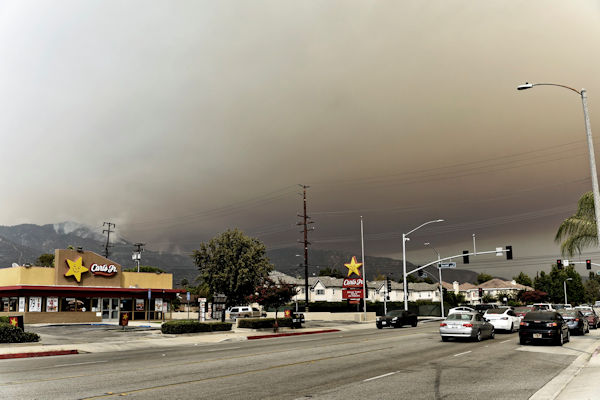 | Smoke from the Bobcat Fire in Angeles National Forest, near Monrovia, Calif., September 2020. Photo: Person-with-No Name, courtesy Flickr Creative Commons. Click to enlarge. |