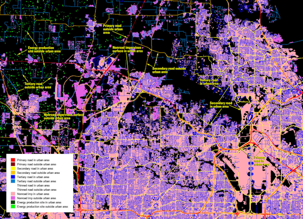 | Datasets in the National Land Cover Database map various U.S. land cover, such as crops or forests. The data map above shows roadways and oil production facilities in an 80-odd square mile area northwest of Dallas, TX. Image: USGS via Public Domain. |