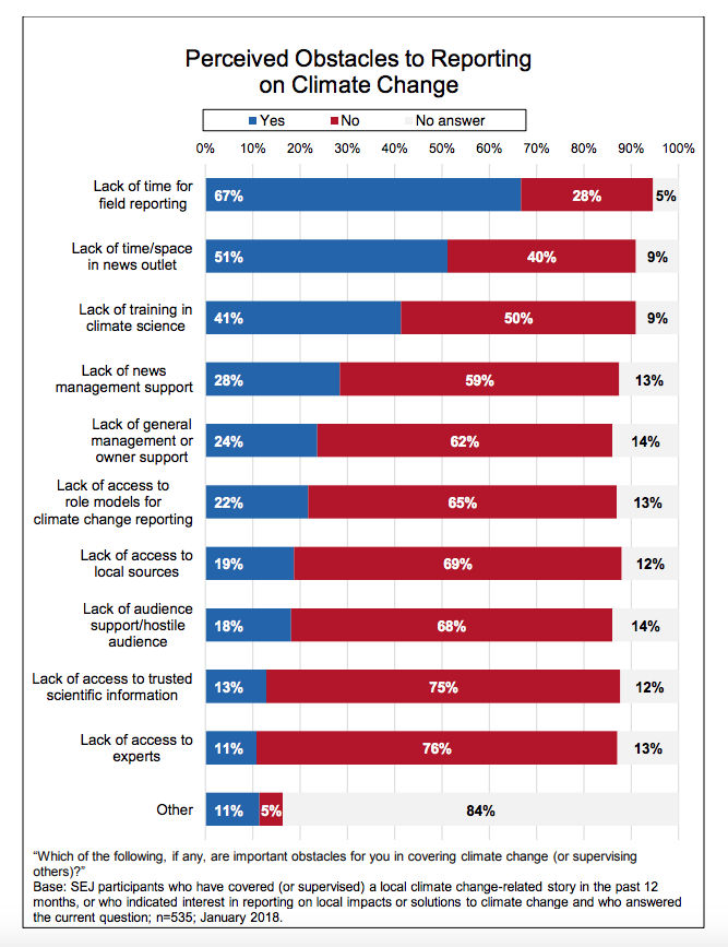 "Climate coverage at local news organizations is critical to the public's understanding of how the changing climate affects them where they live and how they can adapt," SEJ President Bobby Magill said. "It's important for us to understand the challenges journalists face in covering climate change so SEJ and other journalism groups can provide reporters with better tools and training to support their reporting."