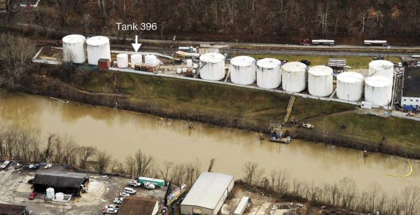 This aerial photograph shows the Freedom Industries tank farm along the Elk River in Charleston, WV. The arrow identifies Tank 396, which leaked the coal-cleaning chemical Crude MCHM into the river on Jan. 9, 2014, contaminating the drinking water of 300,000 West Virginians for weeks. Photo: Commercial Photography Services of WV via U.S. Chemical Safety Board. |