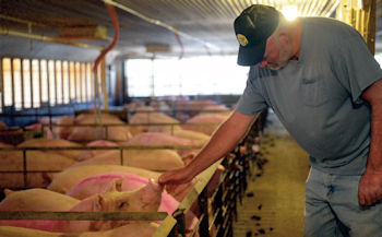 | Dave Hull, farm manager at Tom Butler’s industrial hog farm in Lillington, N.C., greets one of over 6,000 pigs housed in ten hog houses. Photo by Caitlin Kleiboer |