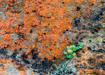 | What do you call a group of alga? Algae, of course. This furry alga coats the north face of rocks in Point Reyes, Calif. Called Trentepohlia, these algae contain green chlorophyll, but red pigments predominate. Photo: Chris Bruggers |