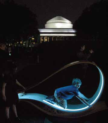 Culminating the celebrations was the most colorful event of all, the Festival of Art, Science and Technology (FAST) that during one weekend in early May presented for the public a score of different exhibitions and installations — all involving “kinetic illumination” — at numerous points on the Cambridge campus and adjacent waters of the Charles River directly opposite downtown Boston. In MIT’s variation on scientific notation, the mostly nocturnal display simply became known as FAST Light.