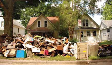 Following the June 2008 floods in Cedar Rapids, Iowa, residents piled large amounts of debris from their homes curbside for eventual pick-up.