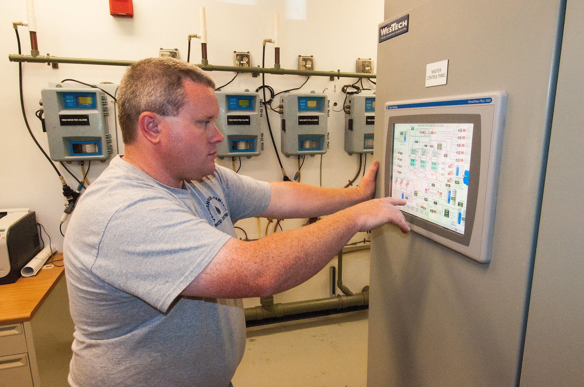 | Worker Chris McKirryher monitors pumps, filters and water storage at the Vergennes-Panton Water District in Vergennes, Vt. The computerization of drinking water systems makes them more vulnerable to hacking. Photo: U.S. Department of Agriculture Rural Development/Bob Nichols. Click to enlarge. |