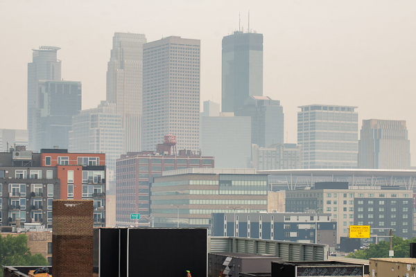 | Smoke from Canadian wildfires in July 2021 partially obscures the Minneapolis skyline. Photo: Chad Davis via Flickr Creative Commons (CC by 2.0). |
