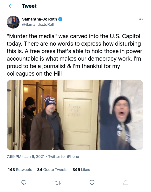 A journalist captured the “Murder the Media” message on her Twitter feed. Image: @SamanthaJoRoth. Click to enlarge. |