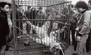 | A decades-old photo of a tiger reportedly being auctioned for its gallbladder bile in Taiwan. Photo: Courtesy of The Realm of India’s Wild & Endangered Royal Bengal Tiger |