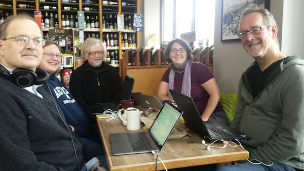 | SEJ members gather at a coffee shop in Madison, WI., to meet, greet, and watch the live stream of The Trump Administration and the Environment: A Reporter's Primer, Feb. 4. L-R: David Steinkraus, Meg Turville-Heitz, Chuck Quirmbach, Jill Richardson and Steve Verburg. |